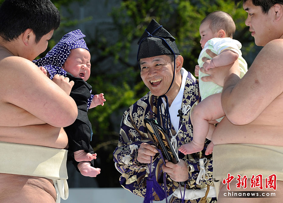 4月25日,日本東京,幾名相撲手手抱嬰兒,正努力使嬰兒哭泣。當(dāng)日,一年一度的日本一周歲以下嬰兒啼哭大賽在東京淺草寺舉行。第一個讓嬰兒哭泣的選手將贏得比賽,日本通過此種比賽為孩子的健康祈福,他們認(rèn)為嬰兒哭泣將對他們將來的身體健康有利。圖片來源:中國新聞網(wǎng)