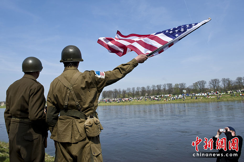 德國(guó)當(dāng)?shù)貢r(shí)間4月24日,演員身著二戰(zhàn)時(shí)期美蘇軍裝在德國(guó)托爾高南部易北河畔的一座小橋上重現(xiàn)當(dāng)年的“會(huì)師”一幕。