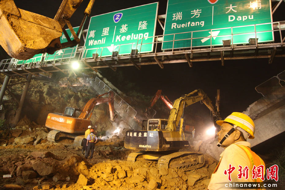 4月25日, 臺灣一條交通要道、“北二高”基隆段發(fā)生山崩意外,傾瀉而下的土石壓垮一座高架橋,并覆蓋道路約200米,據(jù)傳有人車被埋。圖為工程人員連夜開挖,展開大搜救。 中新社發(fā) 董會峰 攝