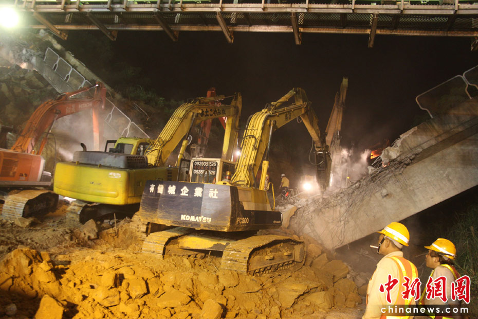 4月25日, 臺(tái)灣一條交通要道、“北二高”基隆段發(fā)生山崩意外,傾瀉而下的土石壓垮一座高架橋,并覆蓋道路約200米,據(jù)傳有人車被埋。圖為工程人員連夜開挖,展開大搜救。 中新社發(fā) 董會(huì)峰 攝