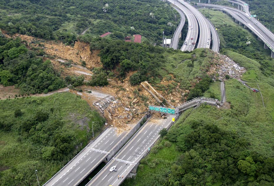 4月25日, 臺(tái)灣一條交通要道、“北二高”基隆段發(fā)生山崩意外,傾瀉而下的土石壓垮一座高架橋,并覆蓋道路約200米,據(jù)傳有人車被埋。(圖片來源:“中央社”)。