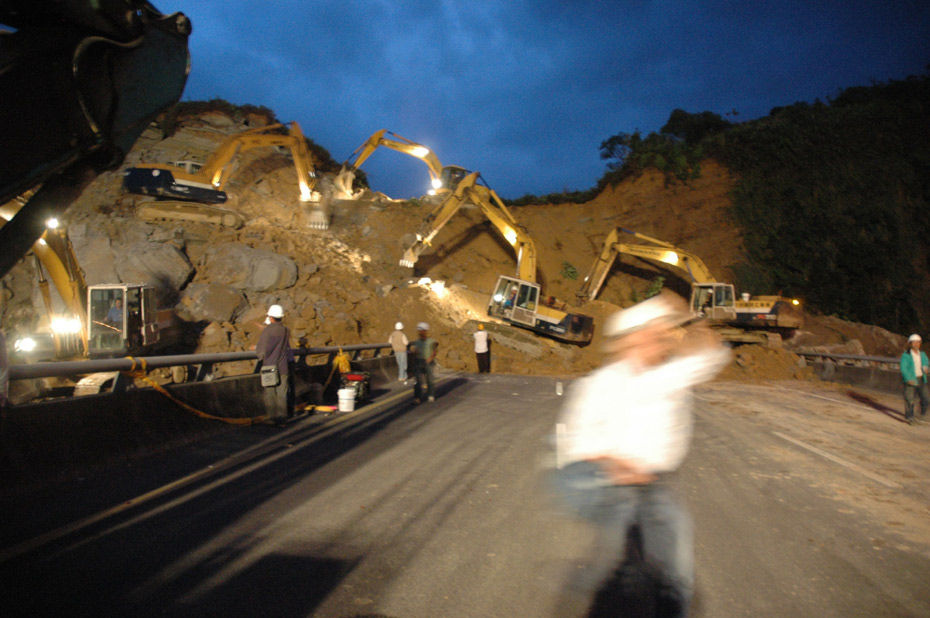4月25日, 臺(tái)灣一條交通要道、“北二高”基隆段發(fā)生山崩意外,傾瀉而下的土石壓垮一座高架橋,并覆蓋道路約200米,據(jù)傳有人車被埋。圖為工程人員連夜開挖,展開大搜救。(圖片來源:“中央社”)。
