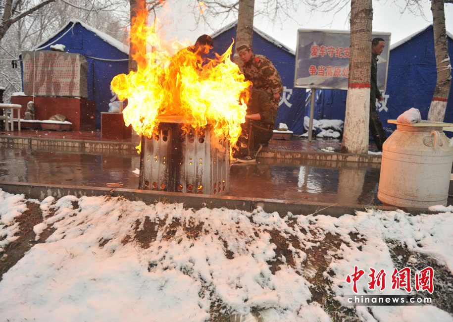 武警青海總隊(duì)玉樹(shù)支隊(duì)是最先投入抗震救災(zāi)的先鋒部隊(duì),地震發(fā)生時(shí)恰逢部隊(duì)出操,營(yíng)房嚴(yán)重受損而官兵平安無(wú)恙。這里立即成為抗震救災(zāi)的軍民和媒體的大本營(yíng)之一,醫(yī)療救護(hù)隊(duì)和新型炊事車(chē)晝夜為軍民服務(wù)。集結(jié)在地震災(zāi)區(qū)的各路部隊(duì)從4月低之前全面轉(zhuǎn)入安置群眾和災(zāi)后重建,這里的的后勤已經(jīng)得到基本保障。 圖為武警新型炊事車(chē)?yán)脷饣癄t冒著雨雪為救援官兵和受災(zāi)民眾做飯。 中新社記者 賈國(guó)榮 攝