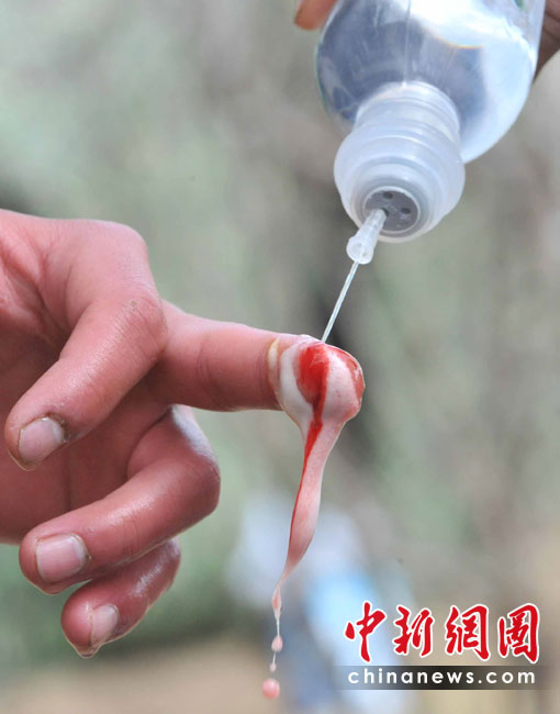 武警青海總隊(duì)玉樹支隊(duì)是最先投入抗震救災(zāi)的先鋒部隊(duì),地震發(fā)生時(shí)恰逢部隊(duì)出操,營房嚴(yán)重受損而官兵平安無恙。這里立即成為抗震救災(zāi)的軍民和媒體的大本營之一,醫(yī)療救護(hù)隊(duì)和新型炊事車晝夜為軍民服務(wù)。集結(jié)在地震災(zāi)區(qū)的各路部隊(duì)從4月低之前全面轉(zhuǎn)入安置群眾和災(zāi)后重建,這里的的后勤已經(jīng)得到基本保障。 圖為官兵手部受傷,用藥品沖洗。 中新社記者 賈國榮 攝