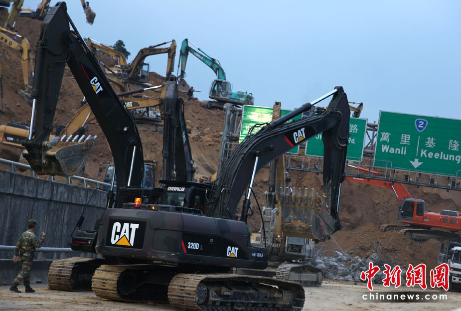 4月27日,臺(tái)灣“北二高”基隆段山體大滑坡意外第3天,開挖搜救風(fēng)雨無阻、持續(xù)進(jìn)行,消防部門陸續(xù)接獲民眾報(bào)告,疑似5車6人被深埋,包括兩輛奔馳轎車、一對(duì)年輕情侶。圖為軍方出動(dòng)大型機(jī)械車參與挖掘工作。中新社發(fā) 董會(huì)峰 攝