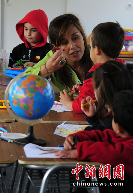 4月26日,今年2月遭受8.8級強(qiáng)烈地震的智利康塞普西翁市,兒童們在“巴士學(xué)!崩锷险n。