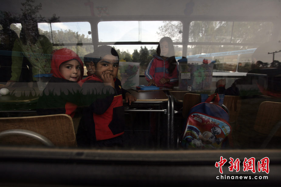 4月26日,今年2月遭受8.8級強烈地震的智利康塞普西翁市,兒童們在“巴士學(xué)!崩锷险n。