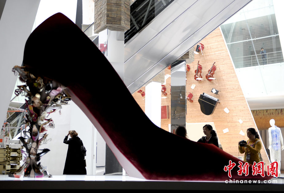 4月27日,一位外國女士走過上海世博園意大利館內(nèi)的高跟鞋展品。中新社發(fā) 廖攀 攝