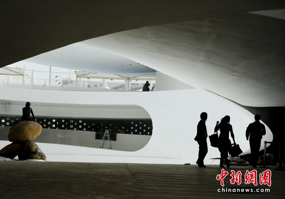 4月27日,上海世博園丹麥館,該館一位女設(shè)計(jì)師走過(guò)美人魚雕像。中新社發(fā) 廖攀 攝