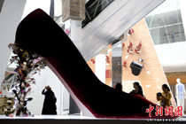4月27日,上海世博會德國館向媒體記者開放,一名工作人員還在緊張布置書籍堆砌的景觀。中新社發(fā) 盛佳鵬 攝