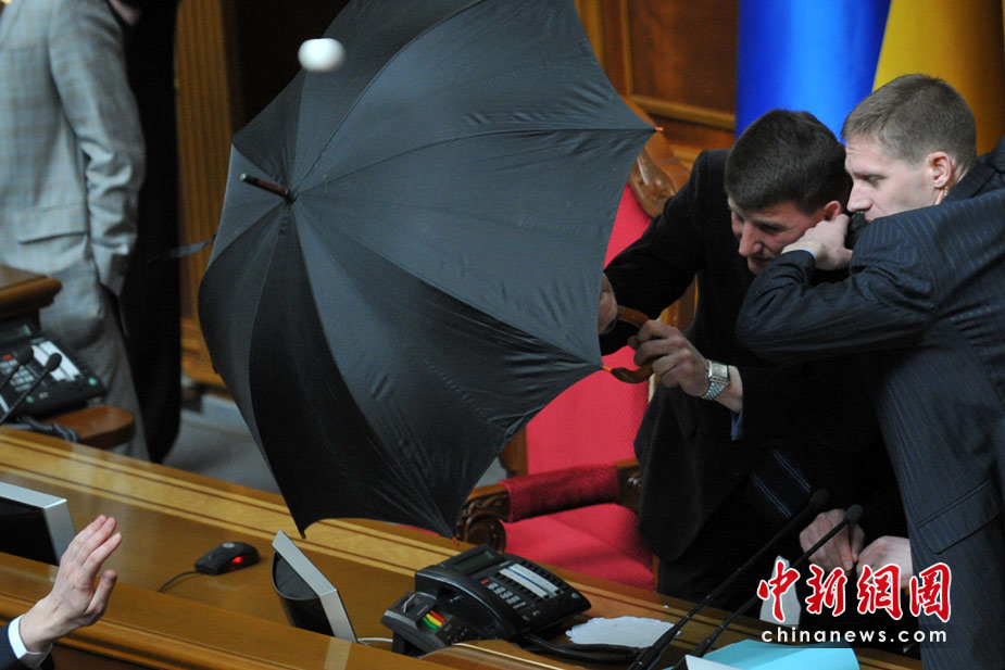 4月27日,基輔,烏克蘭議會(huì)就俄羅斯黑海艦隊(duì)駐扎問題進(jìn)行討論時(shí)出現(xiàn)混亂,數(shù)千人在議會(huì)外示威,會(huì)場(chǎng)內(nèi)有人投擲煙霧彈和雞蛋,大廳內(nèi)煙霧彌漫,場(chǎng)面一度混亂。圖為議長(zhǎng)藏在傘后躲避不斷飛來的雞蛋。
