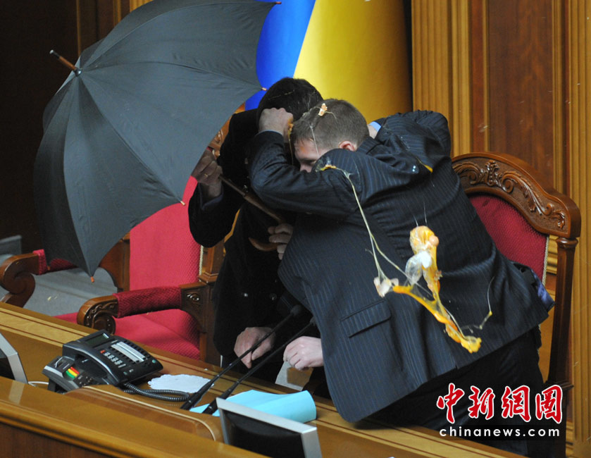 4月27日,基輔,烏克蘭議會就俄羅斯黑海艦隊駐扎問題進行討論時出現(xiàn)混亂,數(shù)千人在議會外示威,會場內(nèi)有人投擲煙霧彈和雞蛋,大廳內(nèi)煙霧彌漫,場面一度混亂。圖為議長藏在傘后躲避不斷飛來的雞蛋。