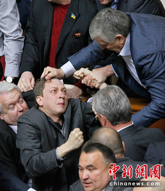 4月27日,基輔,烏克蘭議會(huì)就俄羅斯黑海艦隊(duì)駐扎問題進(jìn)行討論時(shí)出現(xiàn)混亂,數(shù)千人在議會(huì)外示威,會(huì)場(chǎng)內(nèi)有人投擲煙霧彈和雞蛋,大廳內(nèi)煙霧彌漫,場(chǎng)面一度混亂。