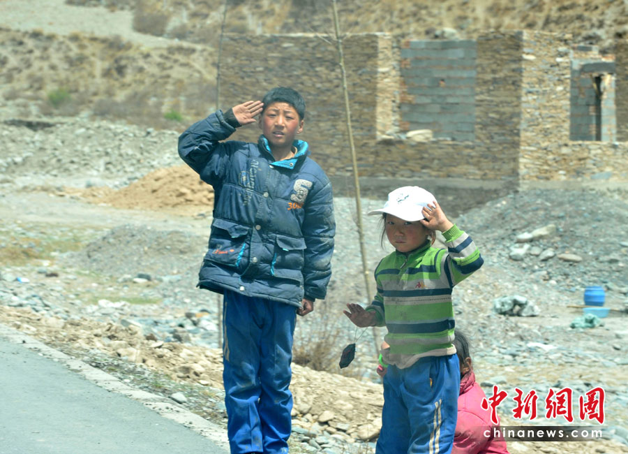 各地赴青海地震救援隊伍4月底前陸續(xù)撤回,玉樹通往西寧的214國道路邊,經(jīng)?梢娪行W(xué)生向回撤的抗震救災(zāi)車隊人員舉手致敬。中新社發(fā) 賈國榮 攝