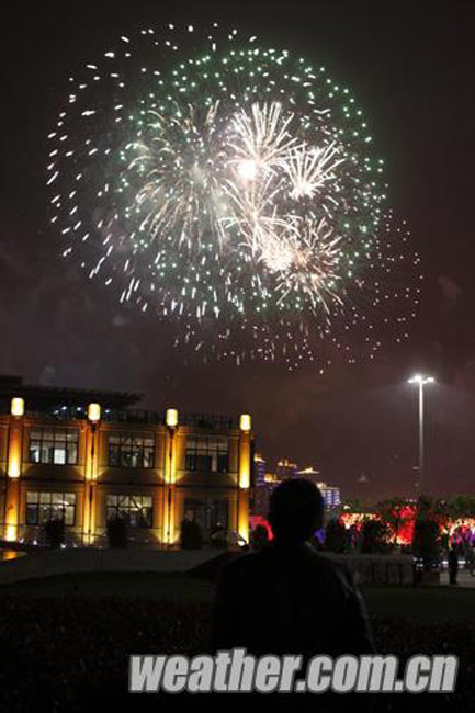 2010年4月27日,上海世博會開幕式彩排順利進行。圖為煙花精彩,駐足觀賞。卞赟 攝