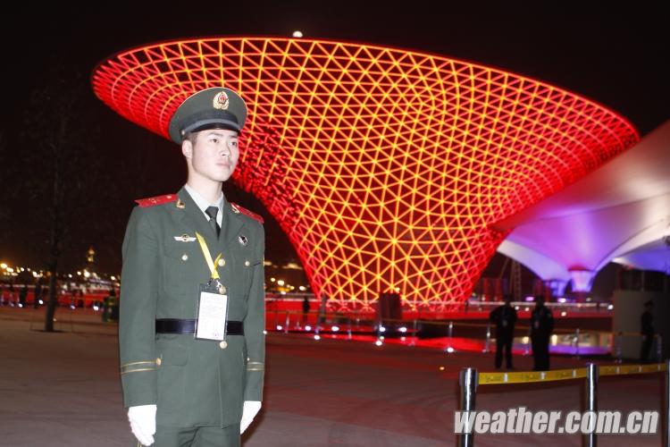 2010年4月27日,上海世博會(huì)開(kāi)幕式彩排順利進(jìn)行。圖為世博彩排現(xiàn)場(chǎng)堅(jiān)守崗位的武警戰(zhàn)士。卞赟 攝(圖片來(lái)源:中國(guó)天氣網(wǎng))