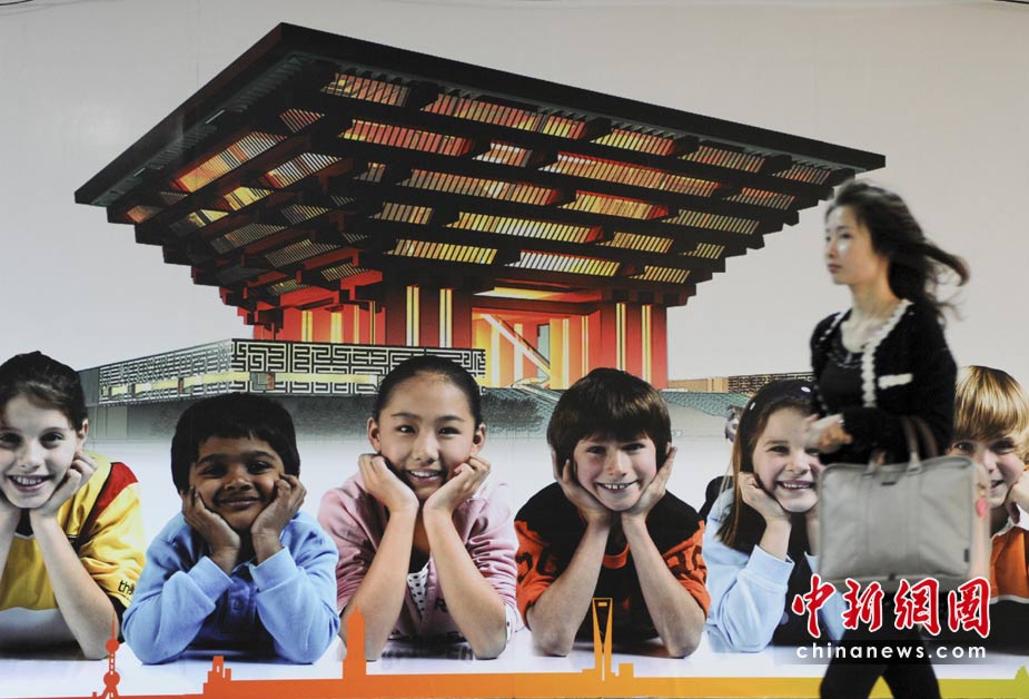 4月29日,一位女士經(jīng)過上海地鐵通道里的世博會(huì)海報(bào)前。世博會(huì)開幕前,面臨“大考”的上海充滿喜慶氣氛。 中新社發(fā) 廖攀 攝