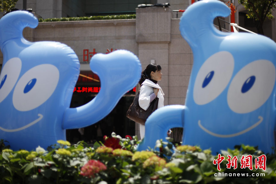 4月29日,上海街頭的世博會吉祥物海寶和行人。世博會開幕在即,面臨“大考”的上海充滿喜慶氣氛。 中新社發(fā) 廖攀 攝