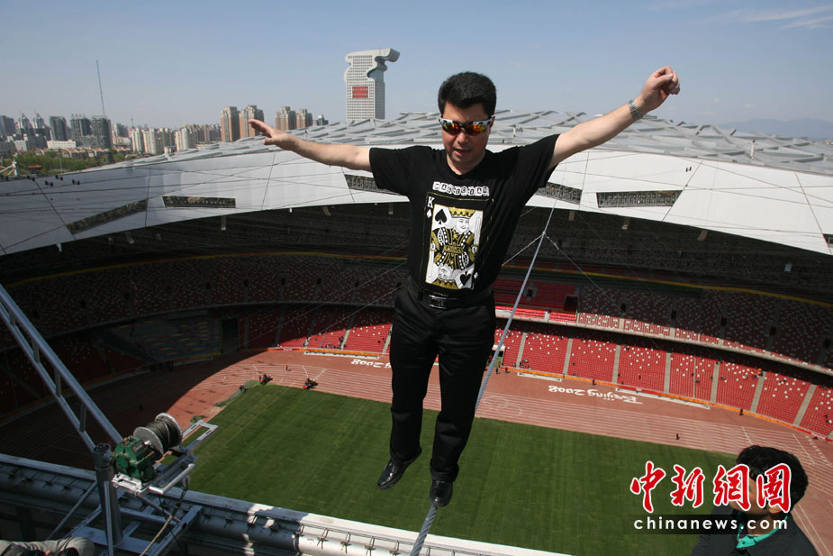4月29日,有高空王子之稱的新疆小伙阿迪力在鳥巢上空成功試演達(dá)瓦孜(高空走鋼絲)。5月3日起,他將在北京國家體育場(鳥巢)頂棚上搭建的小屋生存60天,其間每天將進(jìn)行約5個(gè)小時(shí)的高空走鋼絲表演。 中新社發(fā) 蘇丹 攝