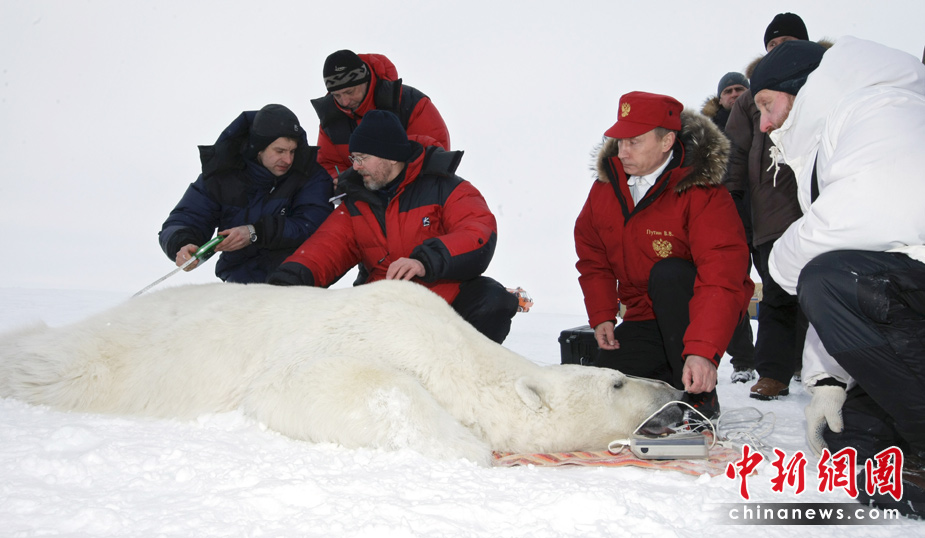 4月29日,俄羅斯總理普京參觀亞歷山大地島(法蘭士約瑟夫地群島)。 普京還與在研究學(xué)者一同給通過專門的陷阱捕獲的北極熊戴上衛(wèi)星定位項圈。此外,學(xué)者們還與普京一起給北極熊進行測量和秤體重,