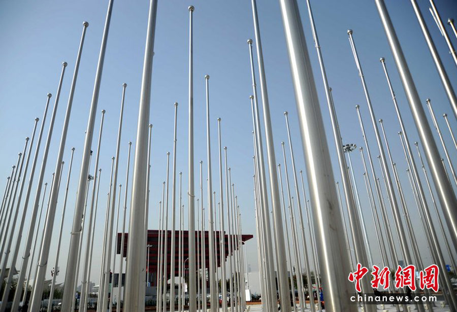 4月29日,中國(guó)上海市2010年世博會(huì)旗林升旗儀式現(xiàn)場(chǎng)準(zhǔn)備就緒。許康平 攝(CFP)