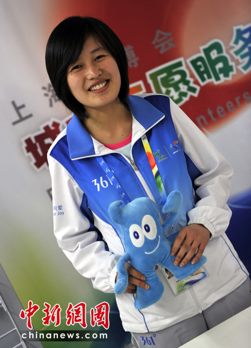 小郭姑娘很熱情地幫助過往的路人,但面對鏡頭的時候卻十分靦腆,不過還是很配合地與海寶合影,并亮出了“志愿者的微笑”。小郭說,作為志愿者,要“齊心協(xié)力,心系世博”,并表示盼望世博會能夠精彩難忘。