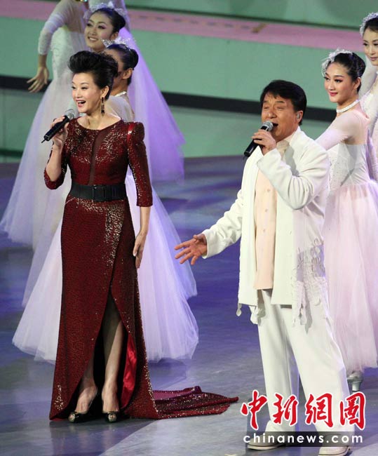 4月30日晚,上海世博會開幕式在世博文化中心舉行。圖為宋祖英、成龍聯(lián)袂獻唱。中新社發(fā) 湯彥俊 攝