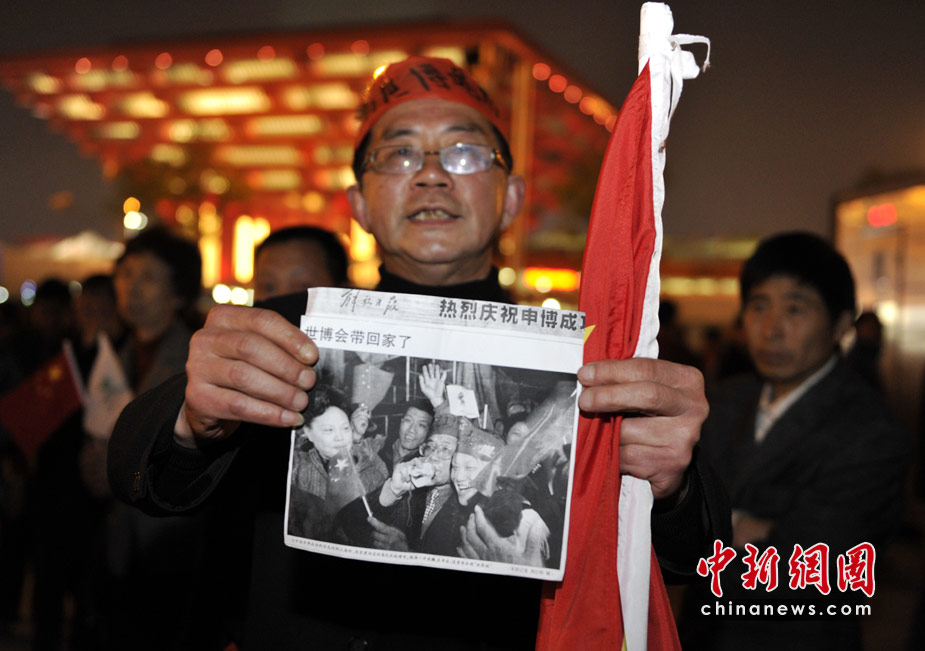30日晚上8時(shí),2010年上海世博會(huì)正式拉開(kāi)帷幕。60多歲的俞大爺頭上戴著寫(xiě)有“為世博喝彩!”的頭箍。他告訴記者,8年前,世博申辦成功的時(shí)候,他也曾經(jīng)戴過(guò)這樣一個(gè)頭箍,上面寫(xiě)著“我們成功了!”圖為俞大爺展示8年前申博成功時(shí)報(bào)紙上登的他的照片。中新網(wǎng)記者 王紅綱 攝