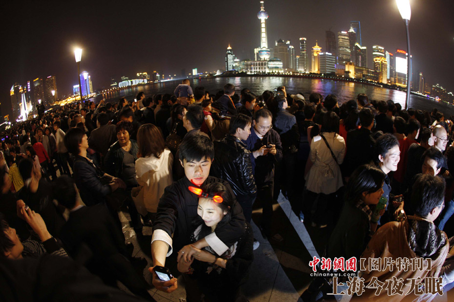 4月30日,上海世博會開幕,黃浦江畔火樹銀花姹紫嫣紅,這座夢想成真城市的千萬居民,在這個注定難忘的夜晚盡情燃燒和釋放著自己的激情。圖為一對情侶在擁擠的外灘合影。中新社發(fā) 盛佳鵬 攝