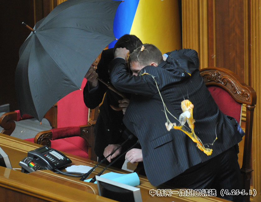 4月27日,基輔,烏克蘭議會就俄羅斯黑海艦隊駐扎問題進行討論時出現(xiàn)混亂,數(shù)千人在議會外示威,會場內(nèi)有人投擲煙霧彈和雞蛋,大廳內(nèi)煙霧彌漫,場面一度混亂。圖片來源:中國新聞網(wǎng)>>點擊觀看詳細內(nèi)容
