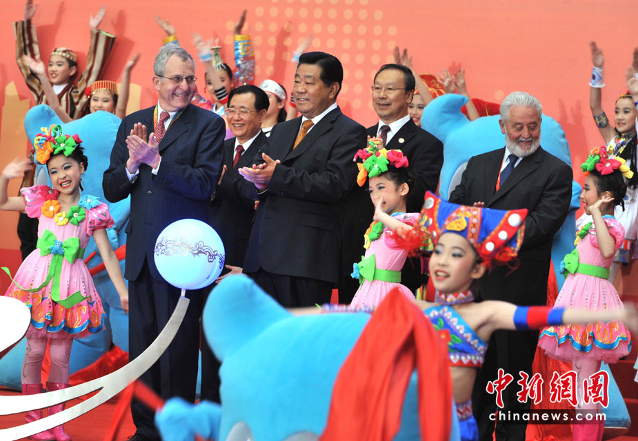 2010年上海世界博覽會(huì)開園儀式于5月1日上午舉行,全國(guó)政協(xié)主席賈慶林與國(guó)際展覽局主席藍(lán)峰共同啟動(dòng)按紐。中新社發(fā) 賈國(guó)榮 攝