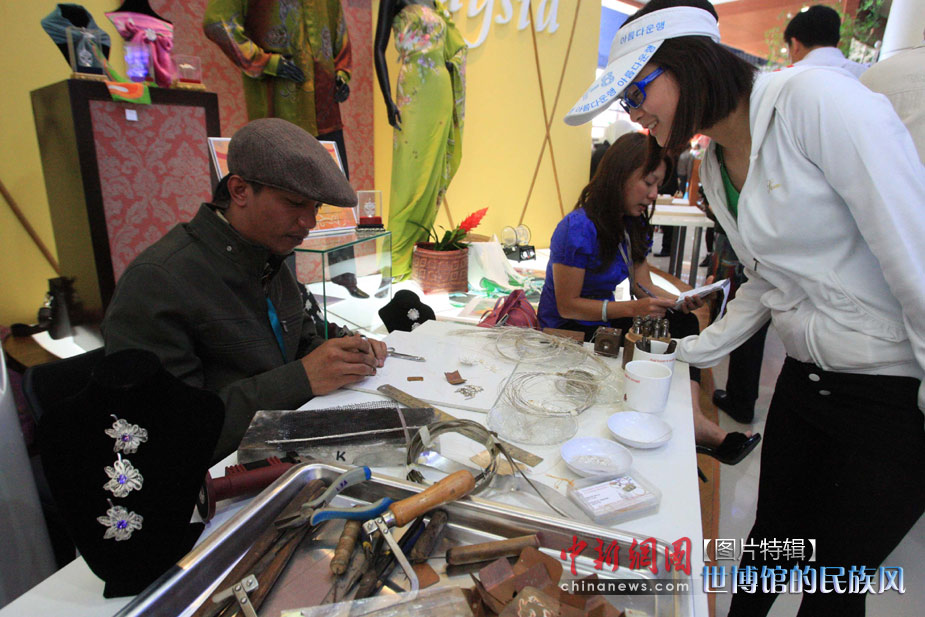 5月1日,上海世博會(huì)馬來(lái)西亞館開(kāi)館,手工藝人用金銀絲打造漂亮的胸針,讓參觀者驚訝不已。中新社發(fā) 潘索菲 攝。