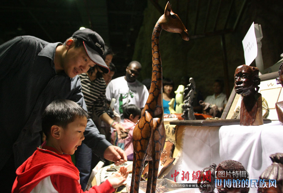 5月1日,上海世博會(huì)開園第一天,非洲聯(lián)合館內(nèi)陳設(shè)的工藝品吸引了一對(duì)父子游客。中新社發(fā) 蘇丹 攝