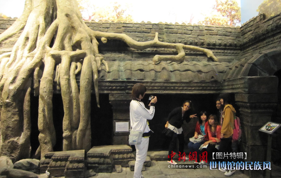 5月1日世博會開園首日,柬埔寨館內(nèi)復(fù)制的塔布籠寺大樹成中國游客留影最多的場景。塔布籠寺那棵長在建筑中間的大樹因為美國電影“古墓麗影”而被中國人所熟知。 中新社發(fā) 姜煜 攝