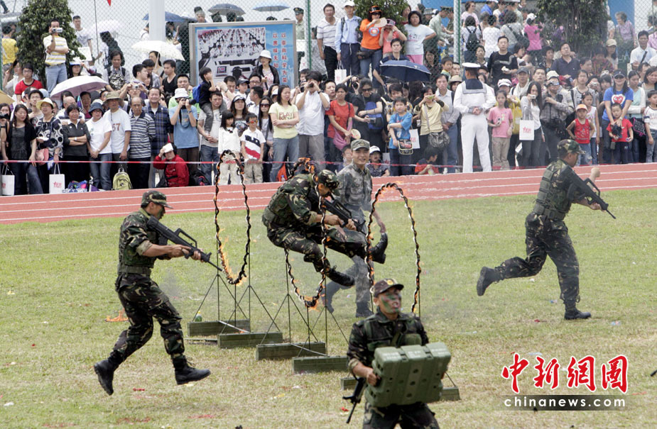為慶!拔逡弧眹H勞動節(jié),進一步增進與香港社會各界相互溝通與交流,中國人民解放軍駐香港部隊5月1日開放了昂船洲軍營,圖為“獵人戰(zhàn)斗”表演。中新社發(fā) 張勤 攝