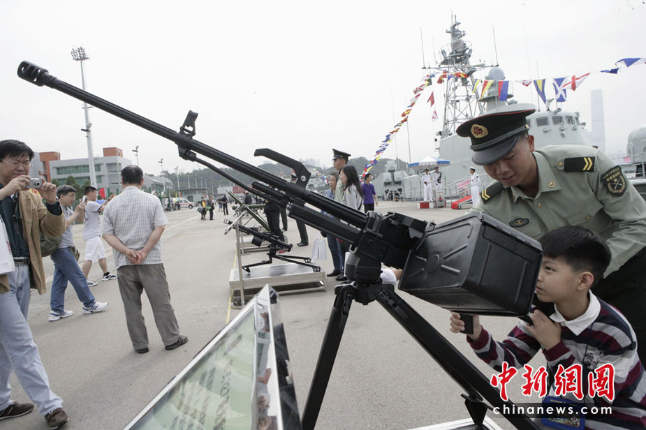 為慶!拔逡弧眹H勞動(dòng)節(jié),進(jìn)一步增進(jìn)與香港社會(huì)各界相互溝通與交流,中國人民解放軍駐香港部隊(duì)5月1日開放了昂船洲軍營,共有約13000名市民前往參觀。圖為香港市民近距離參觀武器展示。中新社發(fā) 張勤 攝