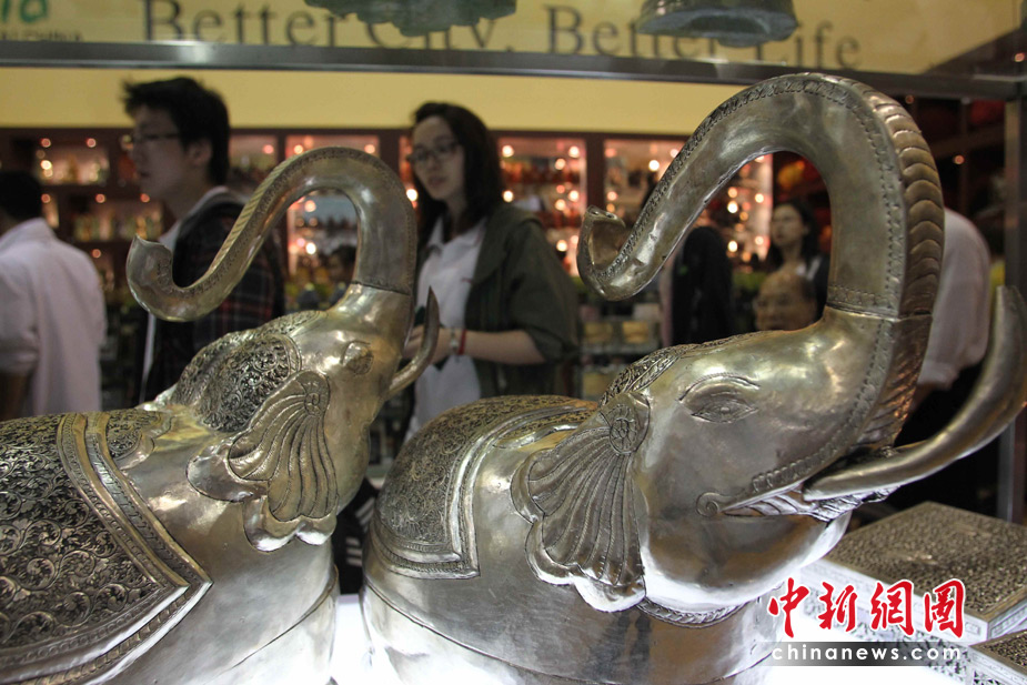 5月1日,觀眾在世博會柬埔寨館被精美的銀器吸引。中新社發(fā) 蘇丹 攝