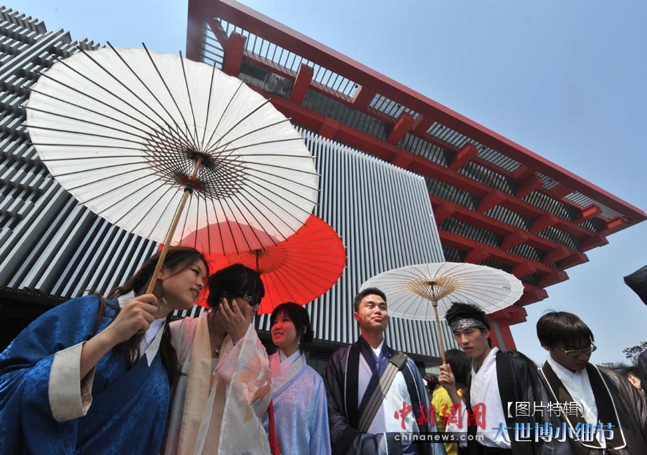5月1日,上海世博會(huì)正式開園,當(dāng)日有20萬(wàn)人次的游客參觀了世博園。世博首日,許許多多的小細(xì)節(jié)都帶給人一種全新的體驗(yàn)。圖為大學(xué)生身著古裝游覽中國(guó)館。中新社發(fā) 賈國(guó)榮 攝