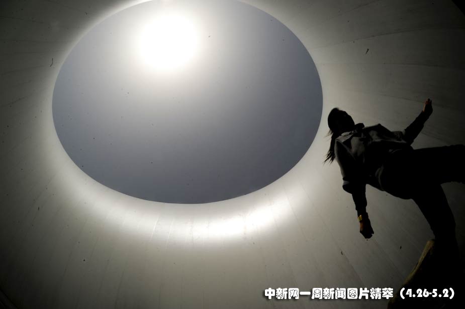 4月27日(周二),一位女士走過上海世博園芬蘭館的圓形天井。