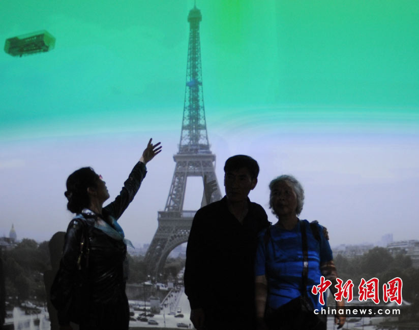 5月2日,上海世博園內(nèi),中國(guó)游客在法國(guó)館親密接觸艾菲爾鐵塔影像。中新社發(fā) 廖攀 攝