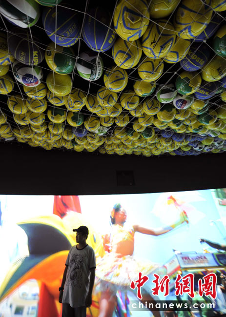 5月2日,上海世博園巴西館,一個小觀眾在播放著桑巴熱舞的環(huán)形屏幕前留影。這個放映廳的天花板是由幾千個足球組成,盡顯“桑巴王國”、“足球王國”的風(fēng)采。 中新網(wǎng)記者 王紅綱 攝