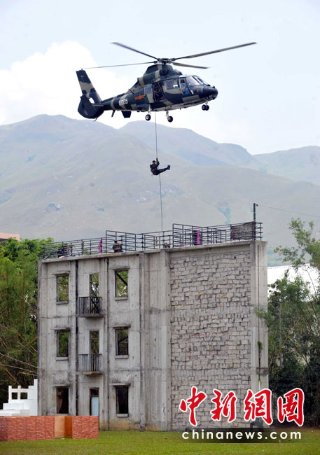 為慶祝“五一”國際勞動節(jié),進一步增進與香港社會各界相互溝通與交流,中國人民解放軍駐香港部隊5月2日開放了石崗軍營。圖為駐港部隊反恐突擊和陸空協(xié)同救援演練表演。 中新社發(fā) 鄧慶樂 攝