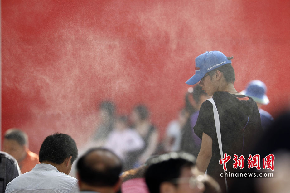 2010年5月2日,上海世博園區(qū)啟動(dòng)各項(xiàng)控溫降溫設(shè)施應(yīng)對(duì)高溫。圖為游客休息區(qū)內(nèi)啟動(dòng)噴霧降溫系統(tǒng)。中新社記者 盛佳鵬 攝