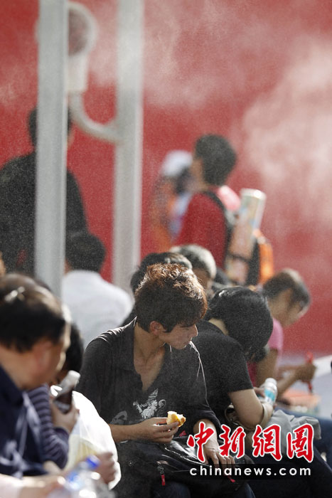 2010年5月2日,上海世博園區(qū)啟動各項控溫降溫設施應對高溫。圖為游客休息區(qū)內啟動噴霧降溫系統(tǒng)。中新社記者 盛佳鵬 攝