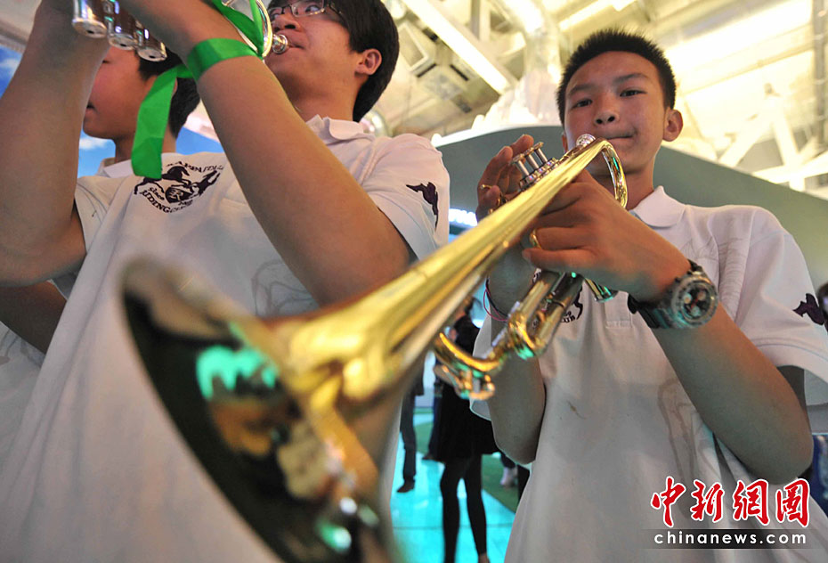 5月2日清晨,來自玉樹地震災(zāi)區(qū)結(jié)古鎮(zhèn)的藏族小樂手巴東珠,含著姐姐在地震中不幸遇難的悲痛心情,與小白楊中學(xué)生管弦樂團(tuán)來到上海世博會(huì),為中國(guó)青海館觀眾獻(xiàn)上一曲《在那遙遠(yuǎn)的地方》。他悲歡交融的情懷和演藝,感動(dòng)全場(chǎng)。巴東珠之前還是青海省人民醫(yī)院為地震傷員做藏語(yǔ)翻譯的志愿者。中新社記者 賈國(guó)榮 攝