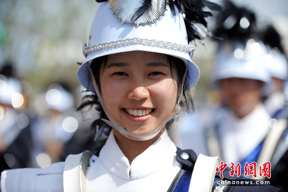 來自泰國南邦甘拉雅尼步操樂團的美少女,在上海世博會園區(qū)舉行的“歡樂盛裝大巡游”中引人注目。中新社發(fā) 陳文 攝