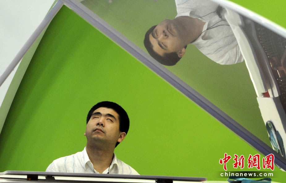 5月4日是上海世博會第四天,盲人鋼琴家孫巖在生命陽光館專設(shè)區(qū)域為眾多殘疾人和觀眾演奏,導(dǎo)盲犬靜臥在他的腳邊,這是世博會歷史上第一次為殘疾人設(shè)館。孫巖2005年獲得“日本橫濱第一屆國際殘疾人鋼琴比賽”金獎,他是中央音樂學(xué)院有史以來第一位盲人大學(xué)生和研究生。他的傾情演奏感動全場,掌聲連連。中新社發(fā) 賈國榮 攝