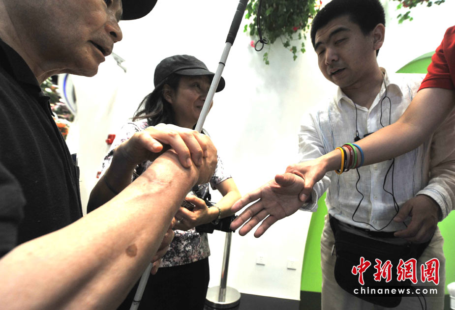 5月4日是上海世博會第四天,盲人鋼琴家孫巖在生命陽光館專設(shè)區(qū)域為眾多殘疾人和觀眾演奏,導(dǎo)盲犬靜臥在他的腳邊,這是世博會歷史上第一次為殘疾人設(shè)館。孫巖2005年獲得“日本橫濱第一屆國際殘疾人鋼琴比賽”金獎,他是中央音樂學(xué)院有史以來第一位盲人大學(xué)生和研究生。他的傾情演奏感動全場,掌聲連連。一位日本盲人參觀者激動地上前致敬。 中新社發(fā) 賈國榮 攝
