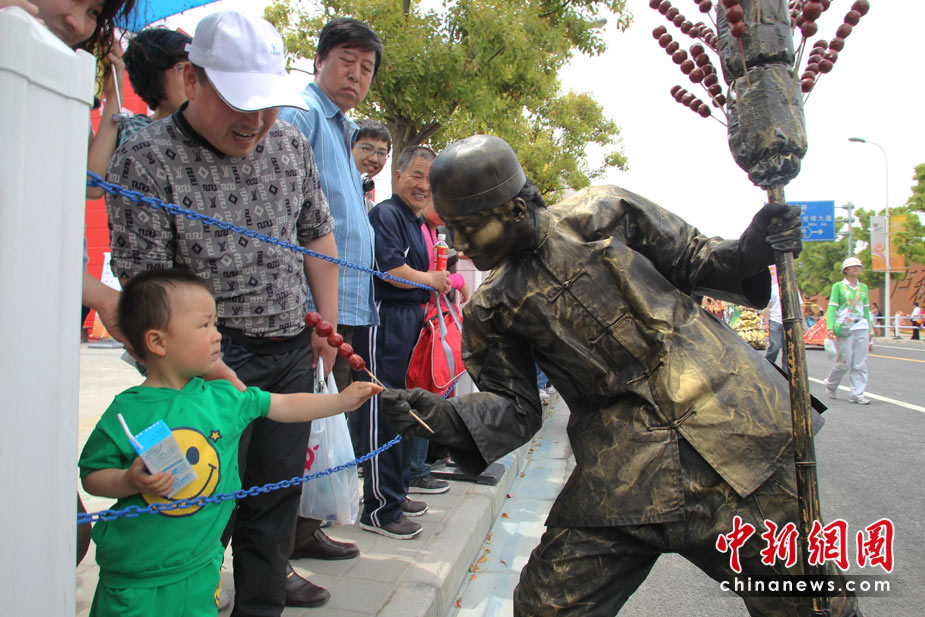 5月4日,上海世博會(huì)北京周花車(chē)巡游演員與觀眾互動(dòng)。當(dāng)日,世博會(huì)北京周開(kāi)幕。中新社發(fā) 蘇丹 攝