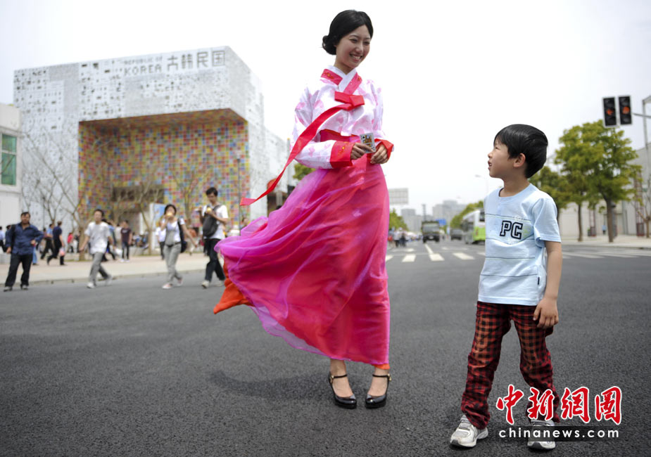 5月4日,上海世博園韓國館外,一位男孩巧遇穿著美麗朝鮮服裝的女士。中新社發(fā) 廖攀 攝
